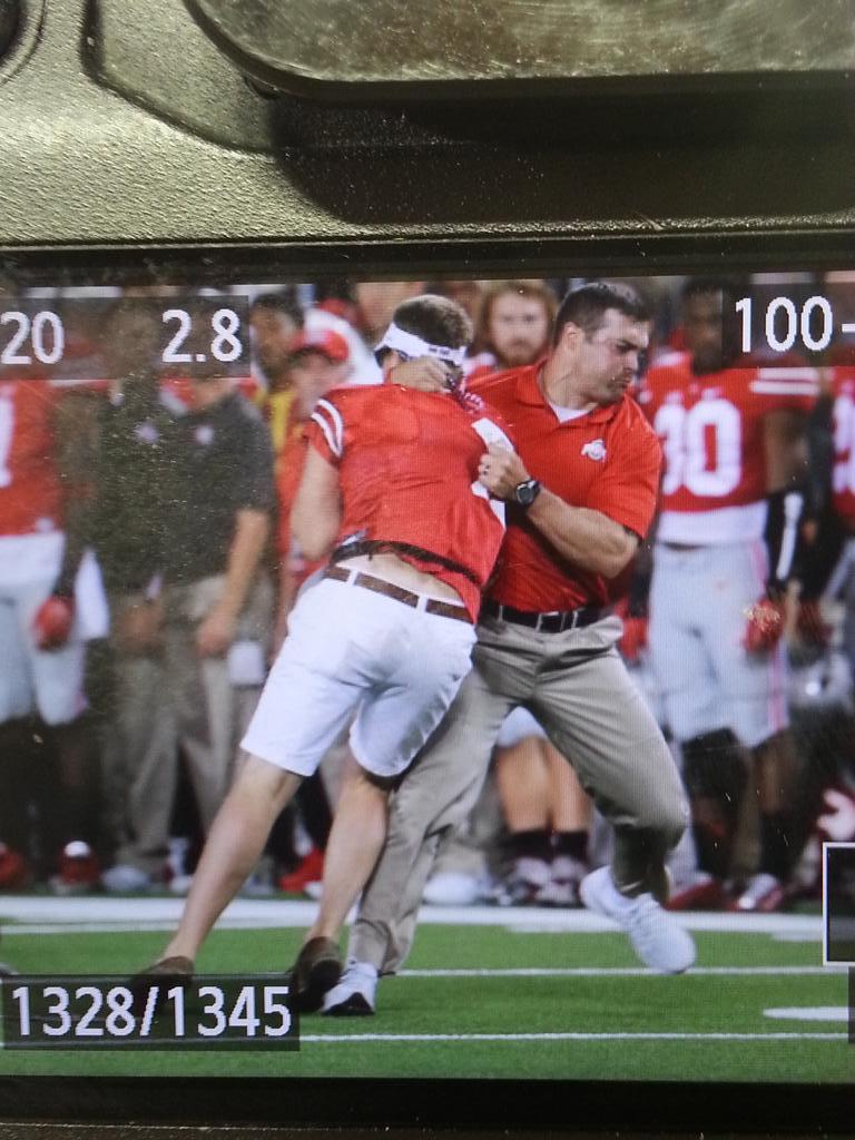 De mooiste tackle vond deze week weliswaar plaats binnen de lijnen, maar hij kwam niet op naam te staan van een speler. Ohio State-assistent Anthony Schlegel maakte korte metten met een Buckeye-fan die lollig wilde doen door het veld op te rennen: